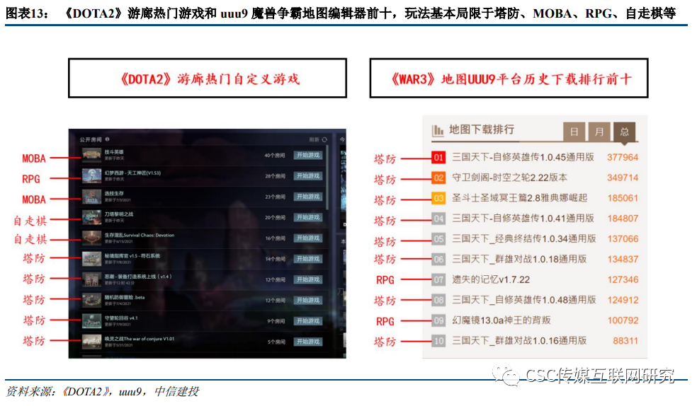 (1) UGC游戏创作目前只有以《罗布乐思》为代表的沙盒类游戏可以实现创作广泛的游戏类型:此前我们介绍了沙盒类游戏由于其底层架构,适合进行UGC游戏创作。除了沙盒类以外的UGC游戏创作工具,例如《DOTA2》自定义游戏、《魔兽争霸3》地图编辑器等,这类游戏衍生工具能生产的游戏类型局限于他们本身依托的游戏(《DOTA2》、《魔兽争霸3》)。例如《DOTA》的编辑器必须建立于MOBA游戏的架构上,主要实现MOBA、RPG、塔防等玩法,无法实现FPS游戏的玩法。