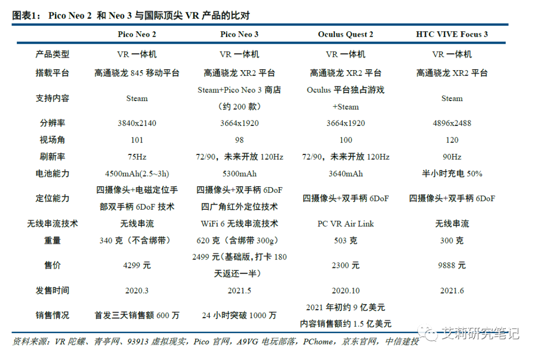 从Pico Neo2 和目前全球顶尖的VR一体机Oculus Quest 2和HTC的Vive Focus 3对比,各项参数和体验上,Pico的产品已经达到或者接近头部产品的性能和体验。我们分析其突出的优点和劣势: