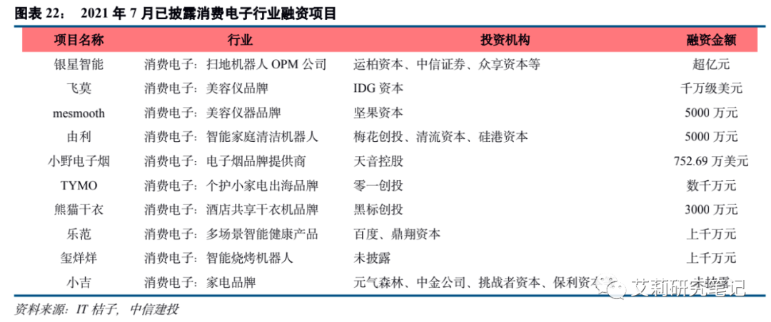 4、消费电子:多个清洁类智能家居品牌获得投资。2021年7月,消费电子行业投融资共10起,6月为2起。融资金额亿级以上的品牌包括银星智能(超亿元)。