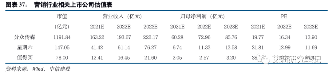 6、投资建议:持续看好新消费行业高景气度,当前重点关注在写字楼等核心生活圈具有强曝光效应的电梯媒体【分众传媒】,以及受益于抖音电商快速增长的服务商【值得买】与达人矩阵丰富的【星期六】。