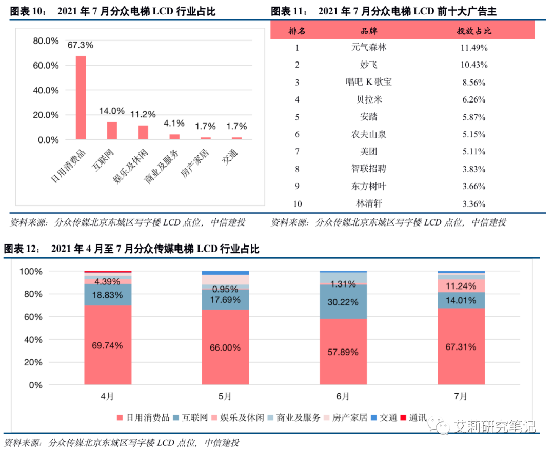 我们每周对分众传媒电梯LCD的单轮广告播放时长、广告主及其所属行业、各广告主及行业的总投放时长等数据进行抽样,抽样地点为北京市东城区的两处办公楼,可能出现因样本容量、地区差异、假期周期等引起的自然偏差。从抽样结果来看,我们更侧重关注新增品牌广告主及其所属行业。