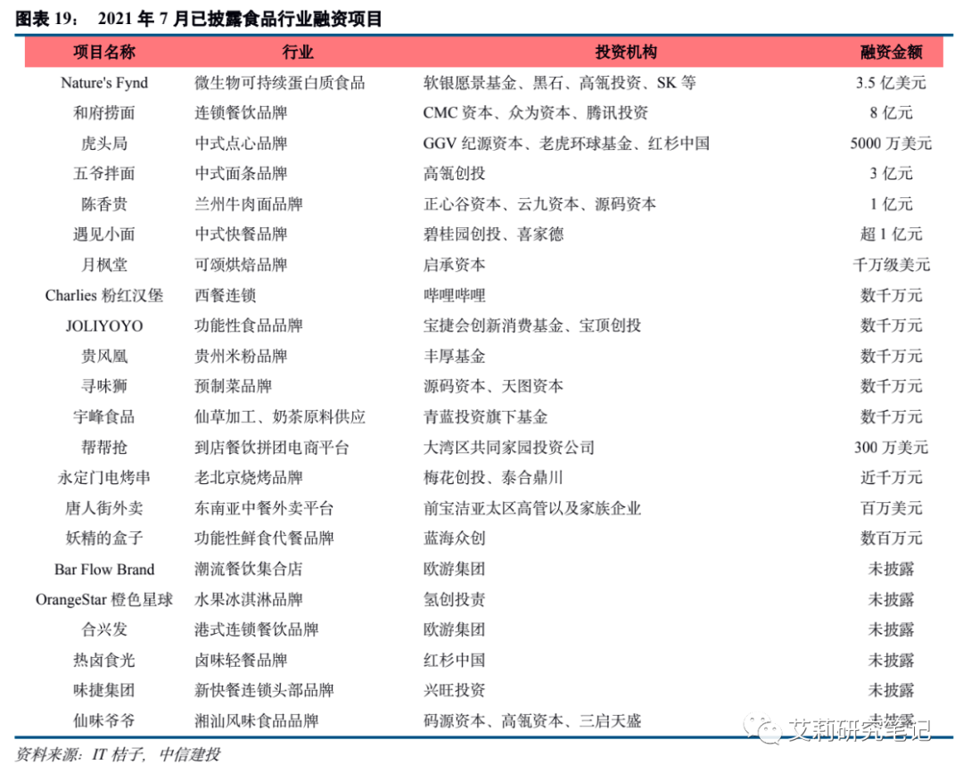 1、食品:面食餐饮近期关注度较高,人造肉热度持续。2021年7月,67起新消费领域投融资中食品饮料行业共22起,6月为20起。融资金额亿级以上的品牌包括人造肉品牌Nature's Fynd(3.5亿美元)、和府捞面(8亿元)、虎头局(5000万美元)、五爷拌面(3亿元)、陈香贵(1亿元)、遇见小面(超1亿元)。