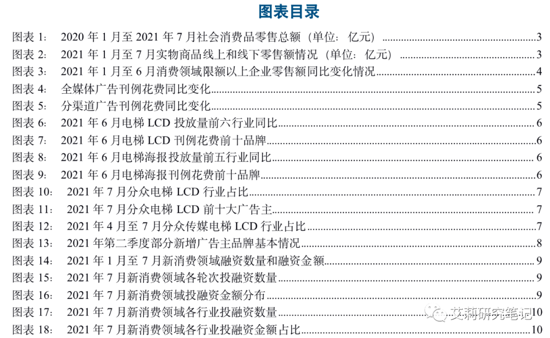 2021年7月,新消费领域的投融资持续火热,融资金额和事件较上月进一步增加,腾讯、字节跳动、哔哩哔哩、百度持续入局新消费,看好行业发展。根据CTR和团队抽样点位数据,新消费品牌对广告投放需求旺盛,前十大广告主中超过一半为饮料酒水和美妆护肤品牌。持续看好新消费行业高景气度,当前重点关注在写字楼等核心生活圈具有强曝光效应的电梯媒体分众传媒,以及受益于抖音电商持续快速增长的服务商值得买、以及达人矩阵丰富的星期六。