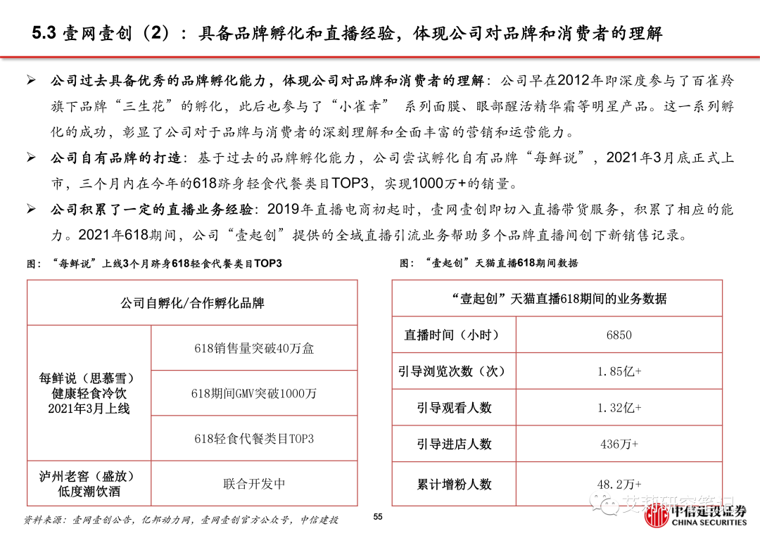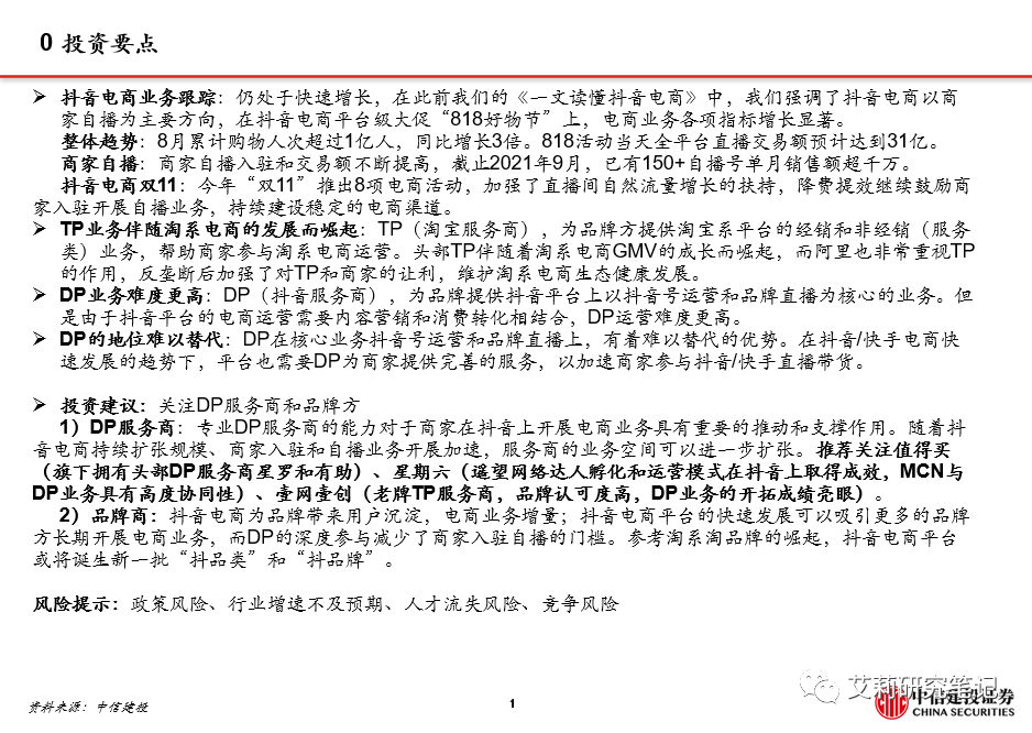 1)DP服务商:专业DP服务商的能力对于商家在抖音上开展电商业务具有重要的推动和支撑作用。随着抖音电商持续扩张规模、商家入驻和自播业务开展加速,服务商的业务空间可以进一步扩张。推荐关注值得买(旗下拥有头部DP服务商星罗和有助)、星期六(遥望网络达人孵化和运营模式在抖音上取得成效,MCN与DP业务具有高度协同性)、壹网壹创(老牌TP服务商,品牌认可度高,DP业务的开拓成绩亮眼)。