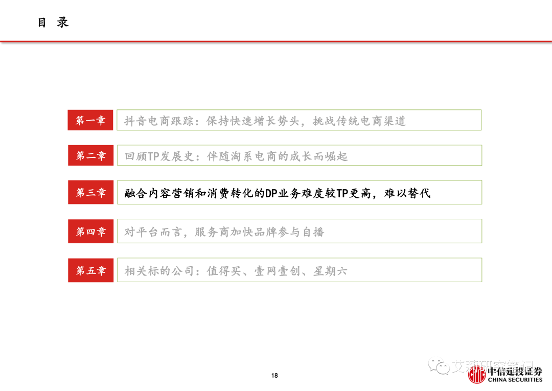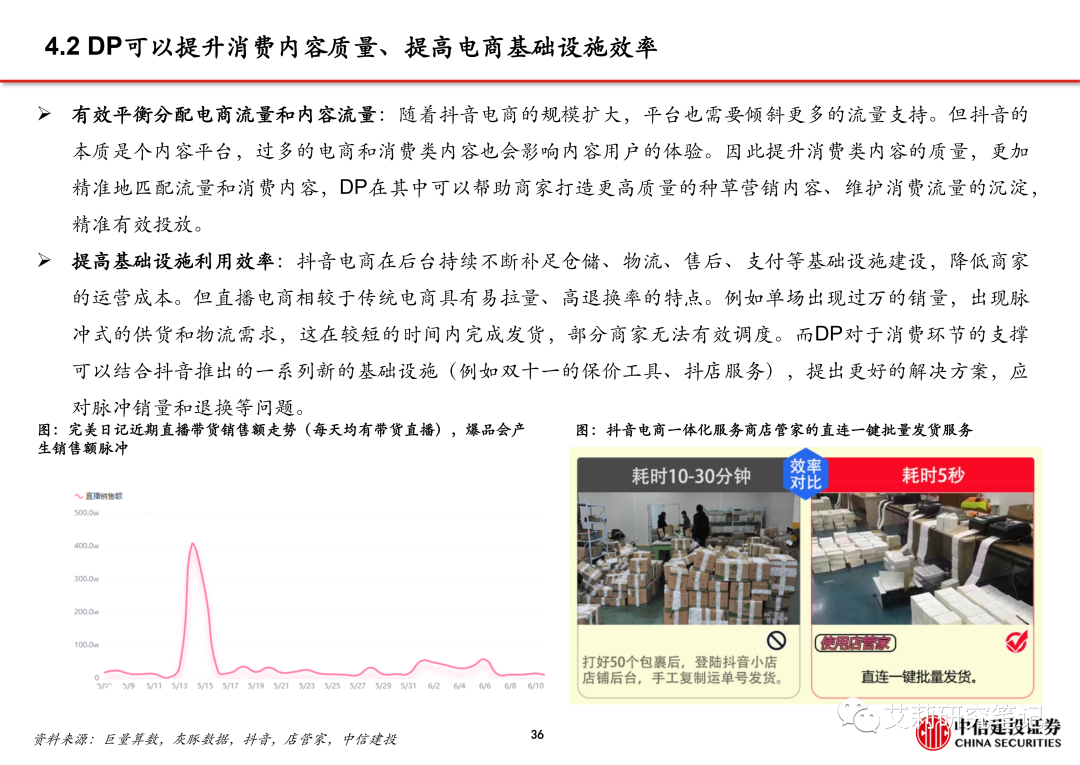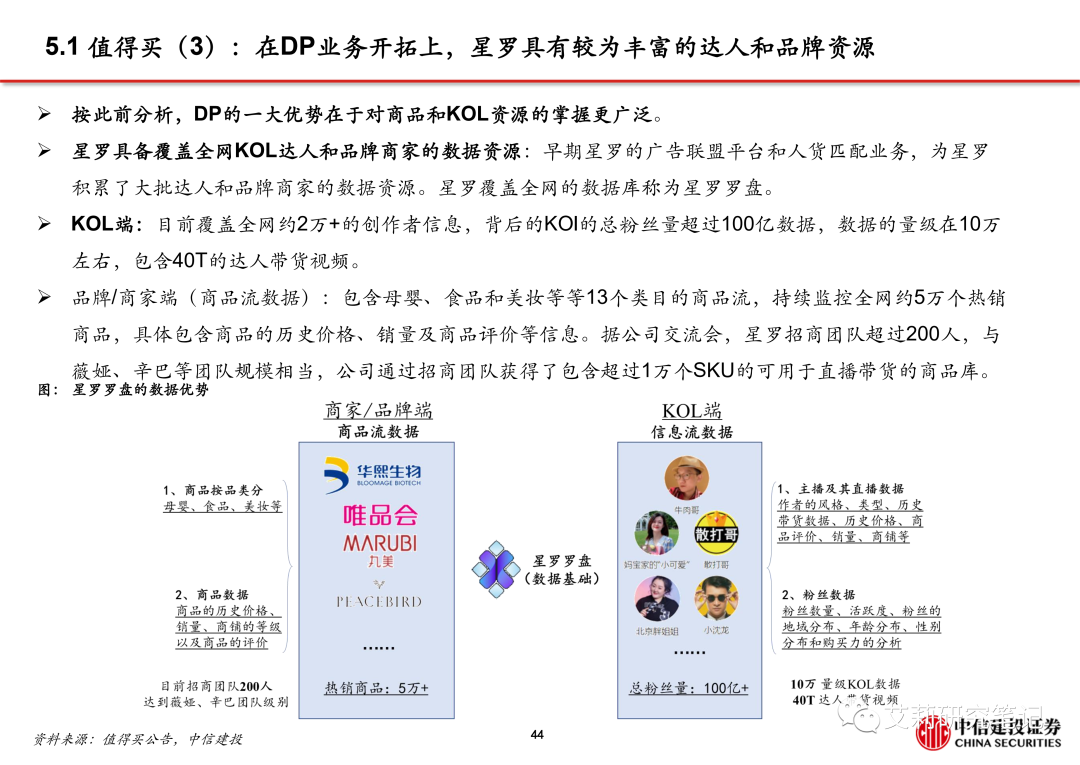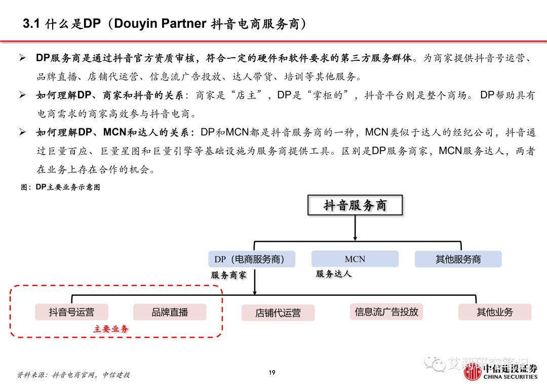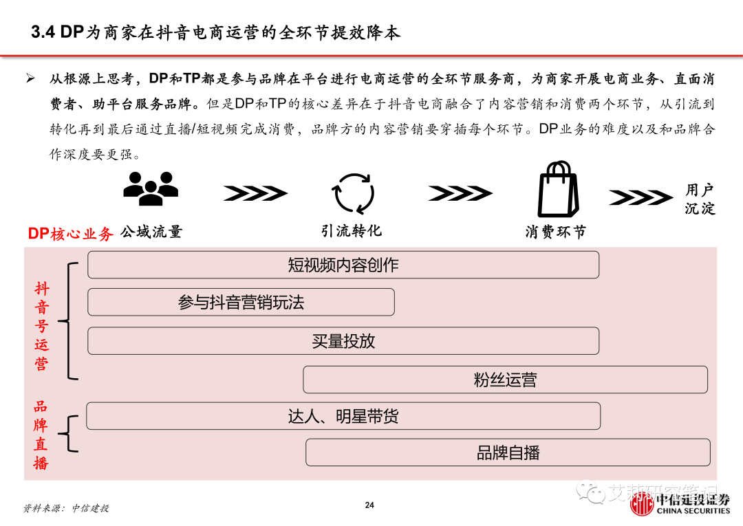3、DP业务难度更高:DP(抖音服务商),为品牌提供抖音平台上以抖音号运营和品牌直播为核心的业务。但是由于抖音平台的电商运营需要内容营销和消费转化相结合,DP运营难度更高。