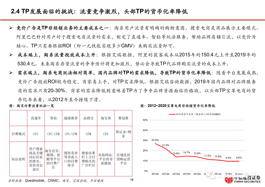 2、TP业务伴随淘系电商的发展而崛起:TP(淘宝服务商),为品牌方提供淘宝系平台的经销和非经销(服务类)业务,帮助商家参与淘系电商运营。头部TP伴随着淘系电商GMV的成长而崛起,而阿里也非常重视TP的作用,反垄断后加强了对TP和商家的让利,维护淘系电商生态健康发展。
