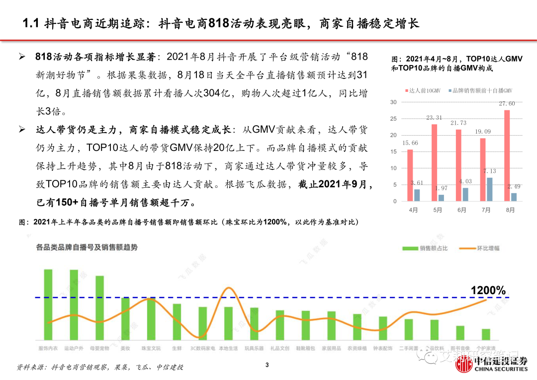 商家自播:商家自播入驻和交易额不断提高,截止2021年9月,已有150+自播号单月销售额超千万。