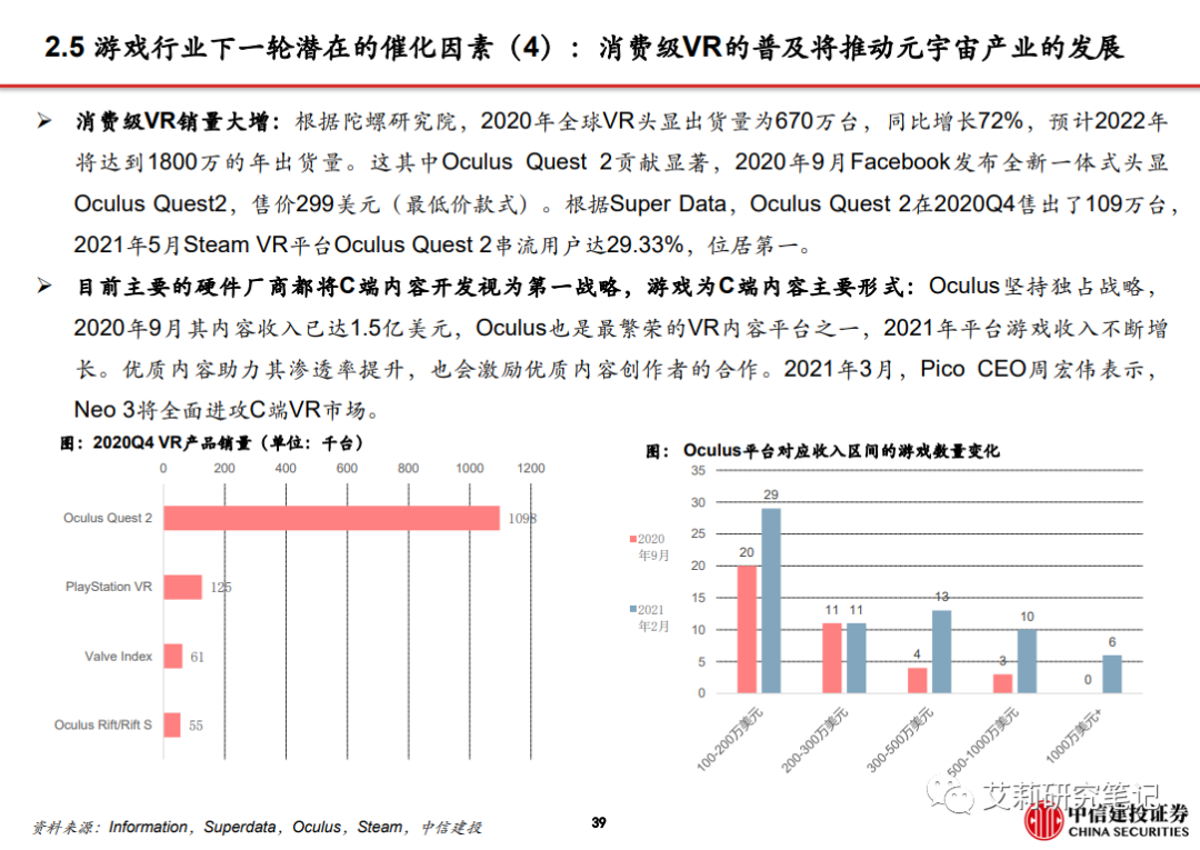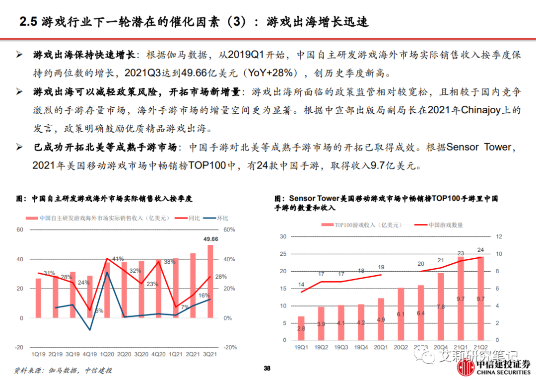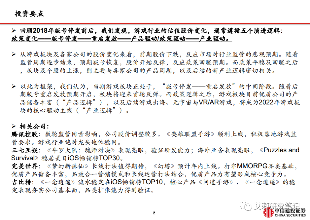 ➢ 以此为框架,我们认为,当期游戏板块正处于,“版号停发——重启发放”的中间阶段。随着后期版号重启发放预期开启,板块将迎来首轮反弹。而政策逻辑之后,游戏板块目前优质公司的产品储备丰富(“产品逻辑”),以及后续游戏出海、元宇宙与VR/AR游戏,将成为2022年游戏板
