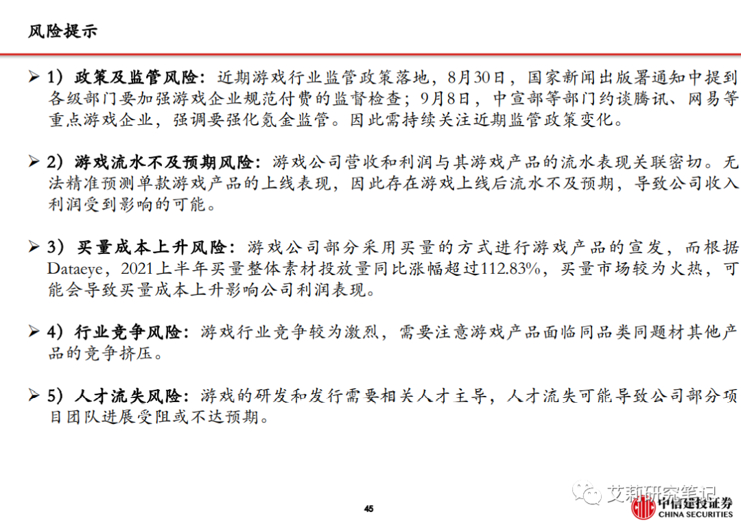 1)政策及监管风险:近期游戏行业监管政策落地,8月30日,国家新闻出版署通知中提到各级部门要加强游戏企业规范付费的监督检查;9月8日,中宣部等部门约谈腾讯、网易等重点游戏企业,强调要强化氪金监管。因此需持续关注近期监管政策变化。2)游戏流水不及预期风险:游戏公司营收和利润与其游戏产品的流水表现关联密切。无法精准预测单款游戏产品的上线表现,因此存在游戏上线后流水不及预期,导致公司收入利润受到影响的可能。3)买量成本上升风险:游戏公司部分采用买量的方式进行游戏产品的宣发,而根据Dataeye,2021上半年买量整体素材投放量同比涨幅超过112.83%,买量市场较为火热,可能会导致买量成本上升影响公司利润表现。4)行业竞争风险:游戏行业竞争较为激烈,需要注意游戏产品面临同品类同题材其他产品的竞争挤压。5)人才流失风险:游戏的研发和发行需要相关人才主导,人才流失可能导致公司部分项目团队进展受阻或不达预期。新消费数据月报 | 负面因素消退,社零增速恢复,小米、美团、B站布局新消费领域【建投传媒互联网】