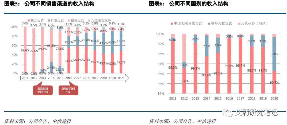 在研发机制/团队/理念创新,重视玩家体验。1-研发机制:鼓励内部创新,采用“自下而上”和“小步快跑”的研发机制:公司鼓励各团队自主研发,并不断挖掘业内潜力人才,近期和快手联合设立惟诺启丰基金,进一步挖掘游戏行业人才和优质项目团队;上线前集中测试和调优,进行快速验证迭代,《一念逍遥》即为公司“小步快跑”模式跑通的典例。2-研发团队:研发费用投入大,研发人员占比高:截止2021H1,公司研发人员共476人,占员工总数比58%,近年来研发人员占比不断扩大;研发人员奖金激励高于行业平均,根据项目流水等情况按月计提项目奖金。3-研发理念:以玩家体验为核心,重视社交性和平衡性。