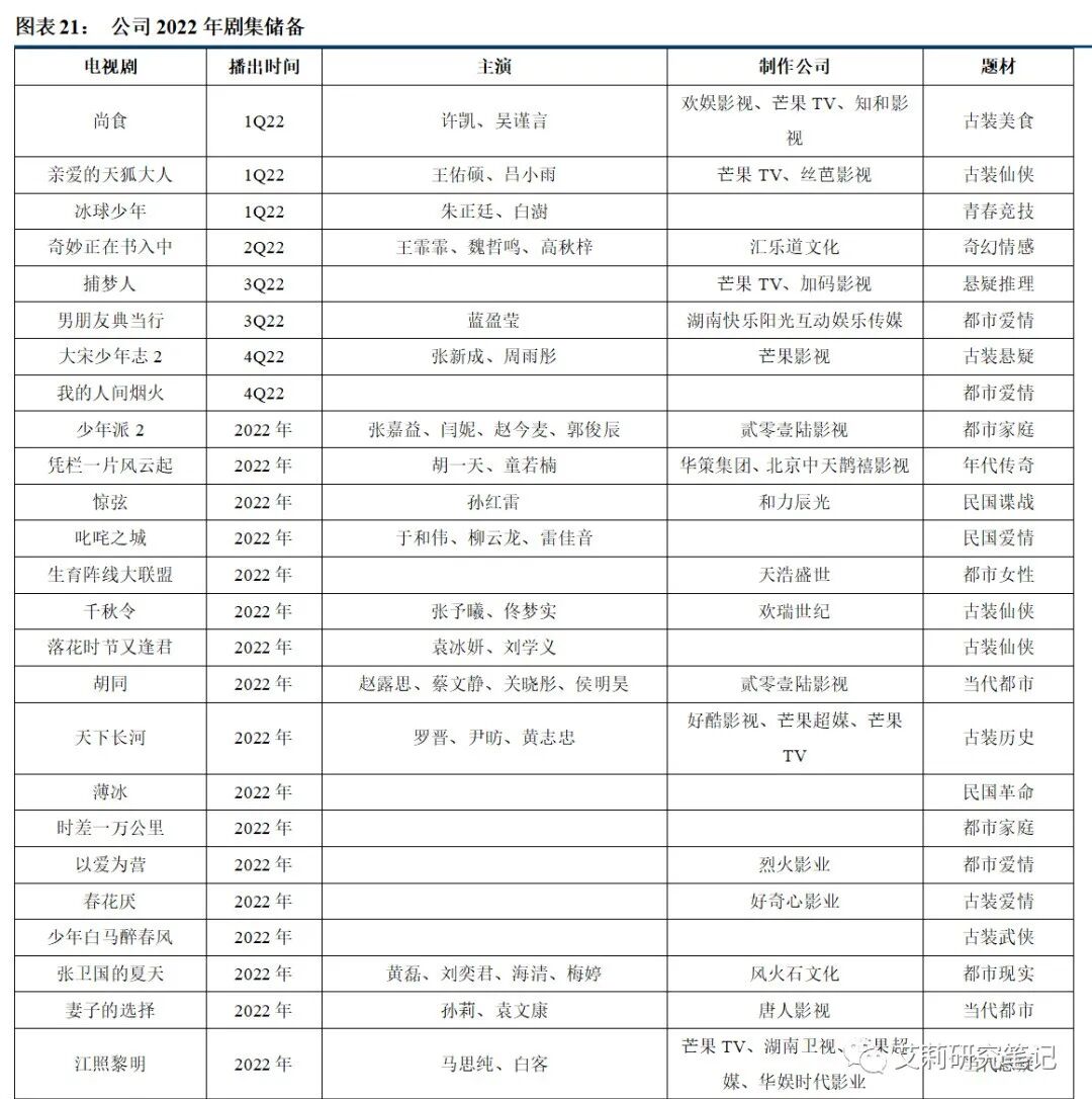 1)剧集:根云合数据,21年全网的剧集上新数量为302部,下降12%。播出平台上,21年几家平台共同播出的剧集数量的占比提升至34%,同比提升6pct。2021年全网连续剧有效播放排行前20的剧集中,有6部是超过两个平台的联合播放,包括《你是我的城池营垒》《司藤》《突围》《骊歌行》等。这意味着每家平台在剧集上的成本也在同步下降。