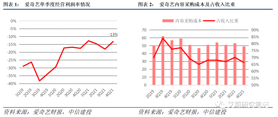爱奇艺公布4Q21财报,四季度经营亏损为9.75亿,经营亏损率为13%,同比/环比优化4.3/4.8pct,Non-GAAP口径,经营亏损率降低至7%,同比优化6pct。此外,公司将在22年全年/单季度实现经营层面盈亏平衡。