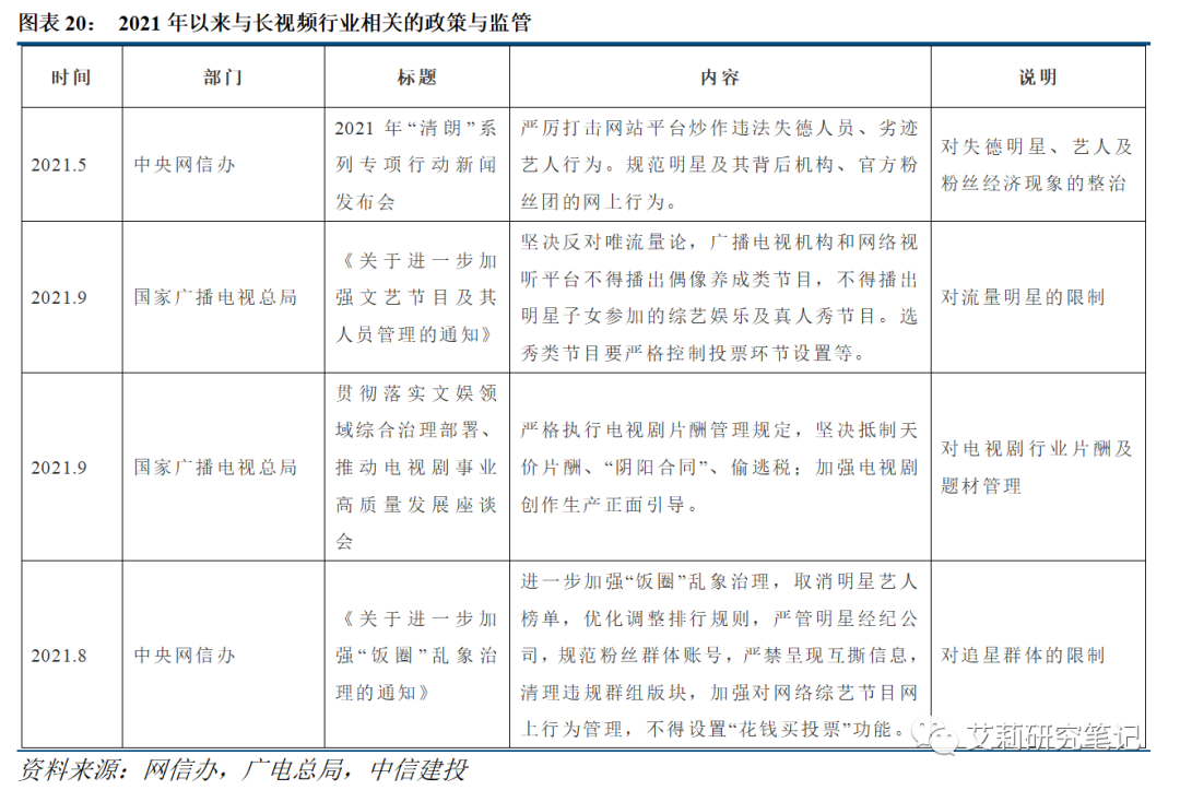 1)对失德、流量艺人的整治:网信办21年5月在“清朗”系列活动中对失德、劣质艺人进行严厉打击;9月,广电总局发布通知对流量明星进行限制,包括反对“唯流量论”、平台也不得播出偶像养成类节目;此外,也对电视剧片酬进行规定,抵制艺人的天价片酬和“阴阳合同”。