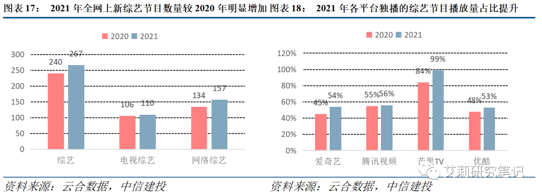 2)综艺:根据云合数据,2021年全网上新综艺共267部,同比增加11%,其中电视综艺110部,同比增加4%,网络综艺157部,同比增加17%。主要是平台自制、独播的网络综艺的增长。2021年芒果TV/腾讯视频/爱奇艺/优酷的独播综艺播放量占比分别为99%/56%/54%/53%,相较2020年分别同比增加15pct/1pct/9pct/5pct。