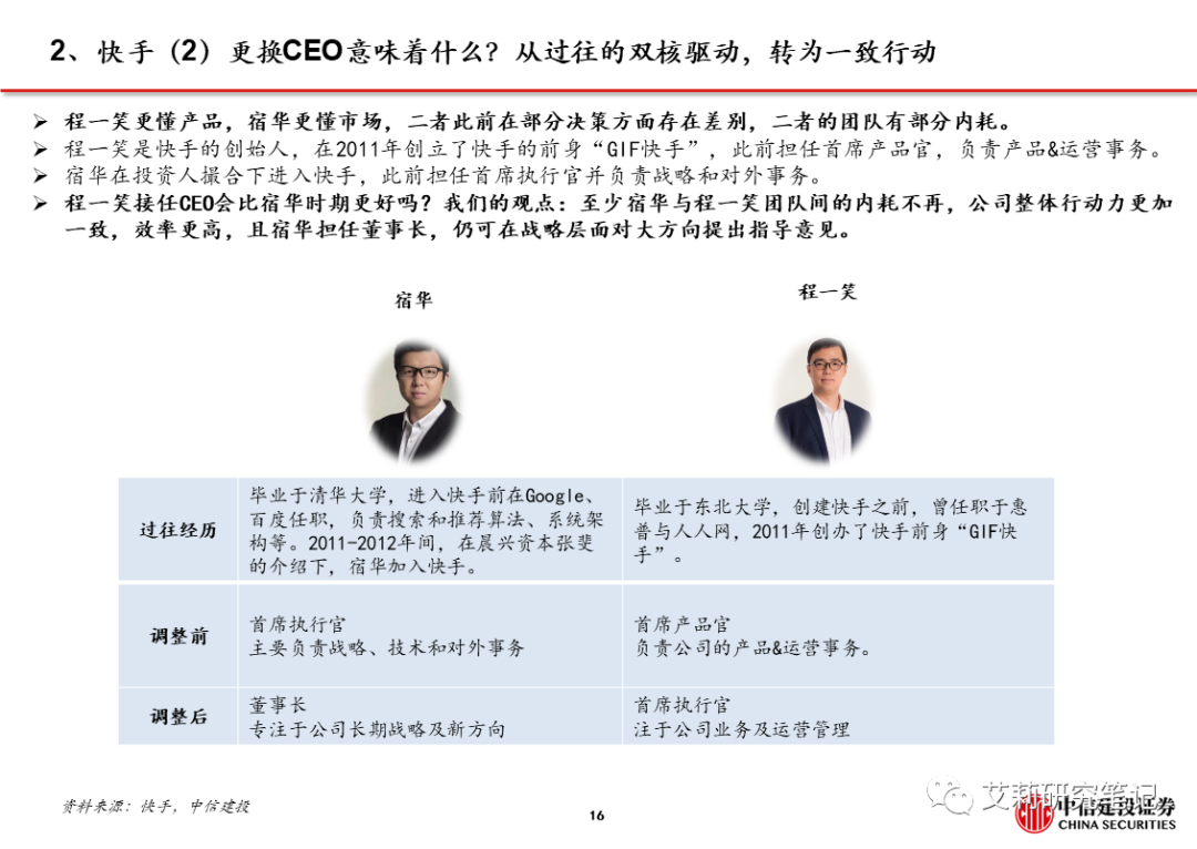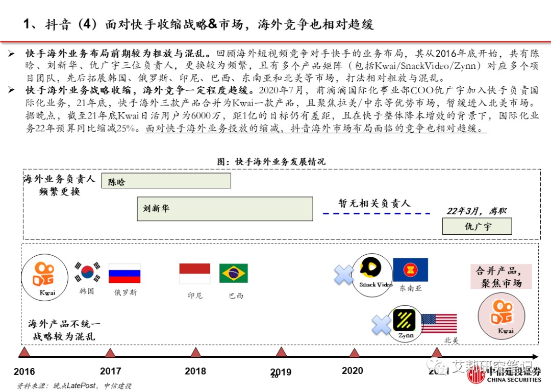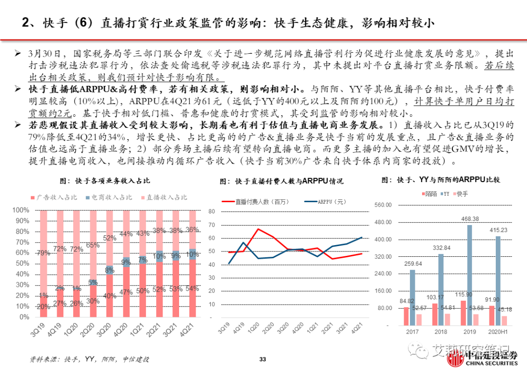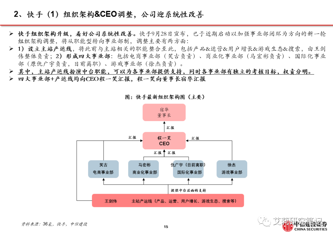 2)快手:组织&管理改善,降本增效是主线。21年10月,公司组织架构由过往的职能型,调整为“4事业群+1线”,从过往宿华+程一笑的双核管理,转为一致向程一笑汇报,部门间内耗降低。王剑伟(主站产运线)、马宏彬(商业化事业群)等历经K3战役等考验的干将成为新的部门负责人并承担KPI与绩效,近期海外负责人仇广宇离职,这一系列组织架构与管理层面的变化,均体现公司对降本增效的长期追求。
