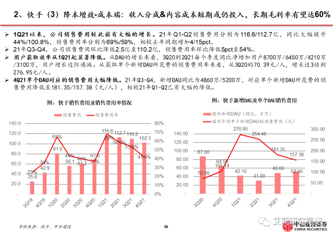 费用端:21年Q3-Q4,快手新增DAU同比为4860万/5200万,对应单个新增DAU所花费的销售费用降低至181.35/157.38(元/人),相较Q1-Q2的150-300元有大幅缩减。