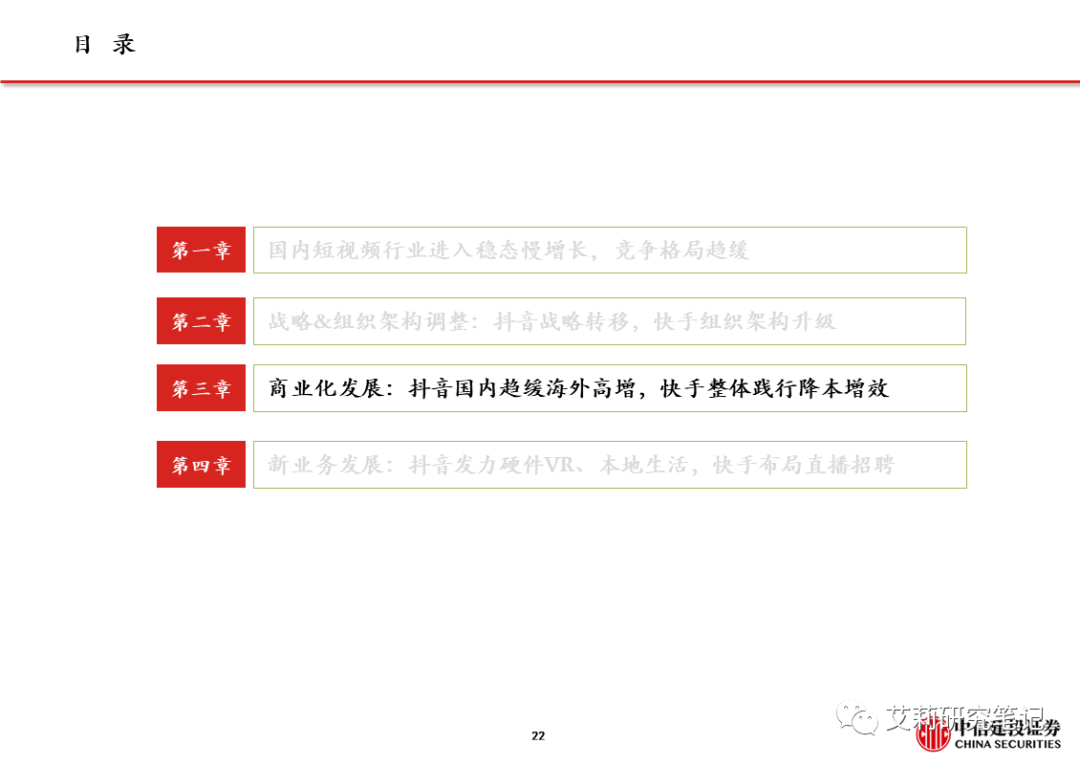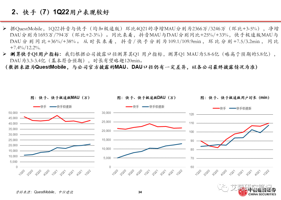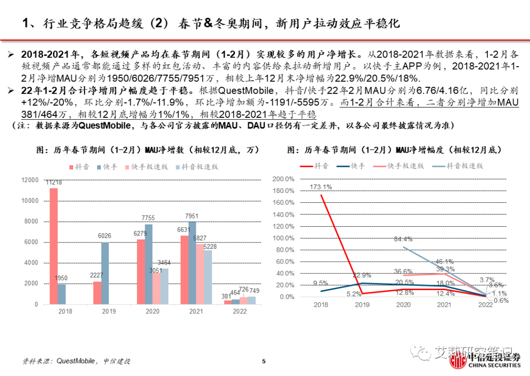 从春晚活动的赞助、红包情况看,竞争格局显著趋缓。20-21年的央视春晚红包活动方分别是快手与抖音,体现两家短视频寡头的竞争,而22年两家均为进行央视春晚赞助;此外,我们也通过草根调研与测试发现,此前抖音极速版红包补贴力度约2倍于快手极速版,在春节期间两家补贴额度也逐渐拉平。