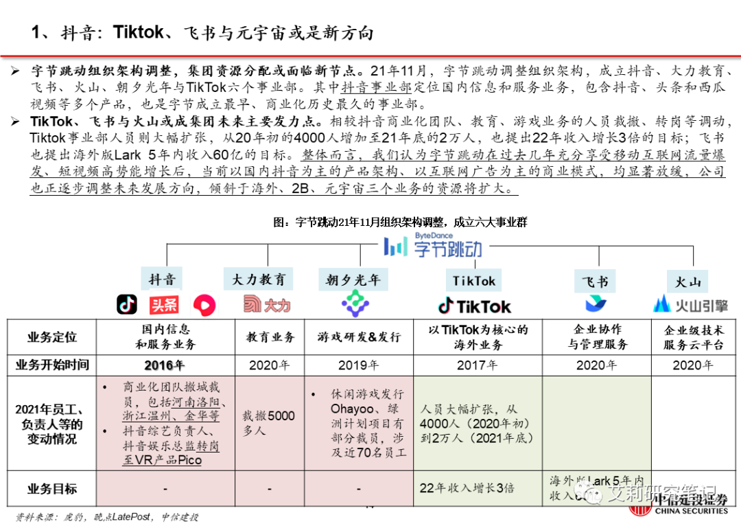 1)抖音:发力海外&下一代互联网。21年11月,字节跳动调整组织架构,成立抖音、大力教育、飞书、火山、朝夕光年与TikTok六个事业部。相较抖音商业化团队、教育、游戏业务的人员裁撤、转岗等调动,公司重点发力海外/2B/下一代互联网等方向,在相关业务的人力和投资加大。