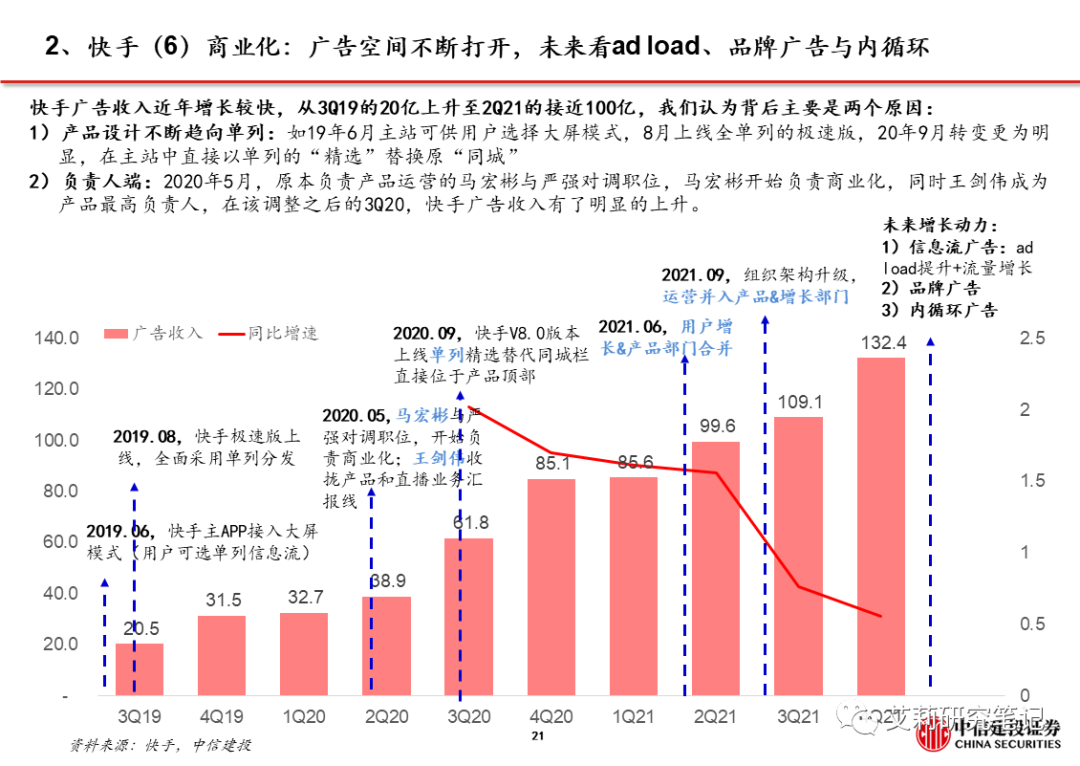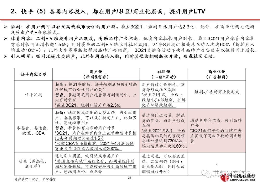 持续加码短剧、体育、明星资源等内容,助益拉新&留存/社区生态/商业化。短剧:用户侧补足高线城市女性的用户群。截至3Q21,短剧日活用户达2.3亿;体育内容:赛事的二创+互动推升社区氛围,21年8月奥运相关总互动人次达60亿(折算月人均互动10次+);此外大型赛事版权帮助品牌广告招商,3Q21奥运活动下快手品牌广告实现高双位数同比增长;引入明星:吸引泛娱乐类用户,周杰伦入驻同时其歌曲翻唱版权开放,形成社区互动。