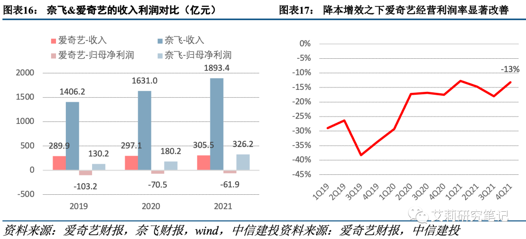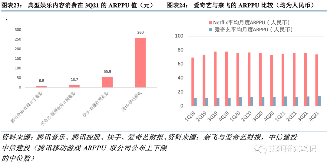 纵向比较:国内平台ARPPU远低于奈飞等海外平台。国内长视频平台代表爱奇艺的ARPPU与海外平台奈飞ARPPU相差较大,19-21年平均来看,奈飞ARPPU保持在75元人民币左右,约是爱奇艺的近6倍。我们此前在报告《中长视频前三季度回顾:中视频内容与商业化向Youtube看齐,长视频在政策驱动下良性发展》中分析,造成这种差异的原因主要是,奈飞单个付费用户的内容投资额为爱奇艺的两倍,一定程度决定了每个奈飞会员可观看的内容数量高于国内平台。而我们认为随着国内平台愈加追求单个项目的效率、盈利能力,产能也将随之提升,长期来看在供给提升之上是有提价基础的。