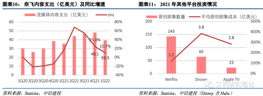 1)海外竞争加剧:国外流媒体玩家众多,奈飞之外亚马逊、迪士尼、苹果与HBO等传统媒体与互联网新玩家不断加入,奈飞市场份额从2Q20的55%下降至4Q21的45.4%,Amazon Prime/Disney+/HBO Max/Apple TV等合计份额从2Q20的10.6%增长到4Q21的20.6%。