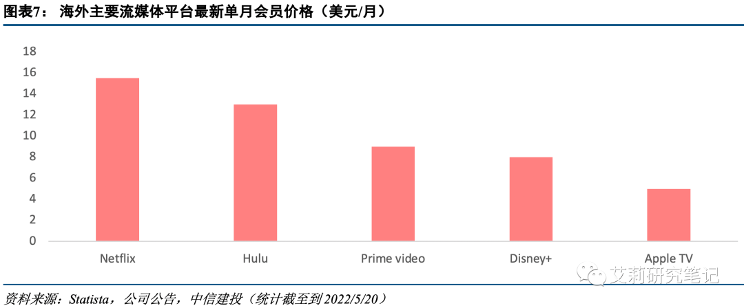 2)奈飞提价频繁,北美ARPPU或遇阶段性天花板:自2014年至今奈飞已提价7次,1Q22北美地区ARPPU为15美元/月,约是Disney+的2倍,短期内北美地区ARPPU或遇瓶颈。