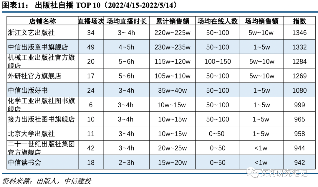 疫情影响图书线下销售,线上渠道尤其是直播电商成为图书零售新渠道,虽然如“小嘉啊”(281.48w)、“主持人王芳”(粉丝1099.83w)、“元梦妈妈选书”(163.86w)等图书带货KOL有一定的影响力,但较大的销售折扣也对出版公司的经营与利润造成影响,自建账号进行自播成为趋势。但目前来看出版社自建账号直播效果一般,根据出版人统计,22年4-5月出版社自播前10名中,浙江文艺出版社排名第一,但场均在线人数仅50-100人,场均销售额在5万-10万;而中信出版也以“中信出版童书旗舰店”“中信出版好书”“中心读书会”等账号矩阵进行直播,但场均销售额不足5万,效果仍有限。