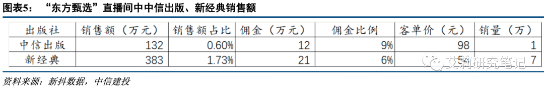 而在“东方甄选”直播间累计销售额前10的产品中,除大米、牛排等农产品生鲜销售较好之外,图书贡献了较多的销售额与销售量,包括童书、经管励志与文艺品类。从销量来看,单款图书在直播间的销量可以达到5-10万册。图书品类的平均佣金率更加合理,一定程度上降低了出版社的渠道成本压力。中信出版、新经典等国内头部大众出版公司的图书也在“东方甄选”直播间获得不错的销售表现。