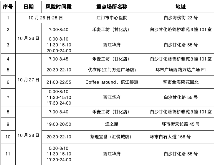 五、白云湖街广东外语外贸大学公开学院饭堂所在楼栋,夏茅海口西乐里4横3号、夏茅海口海旁一巷18号、夏茅西约圆头咀一巷3号、夏茅向北八巷20号由中风险区调整为低风险区。
