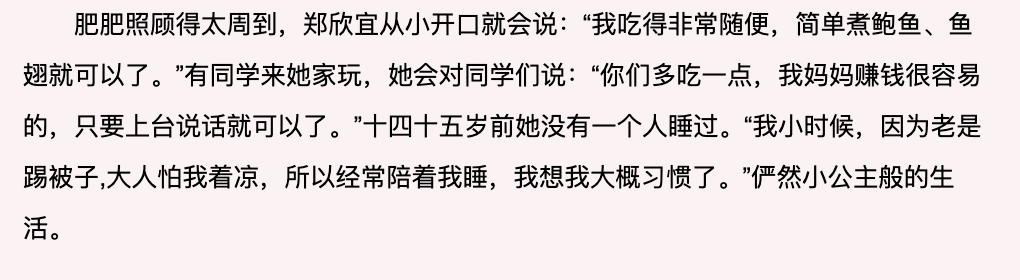 郑欣宜开始怀疑,如果一直这么糟糕,再这么混下去,是不是不但自己成不了事,还会毁掉妈妈的名声?