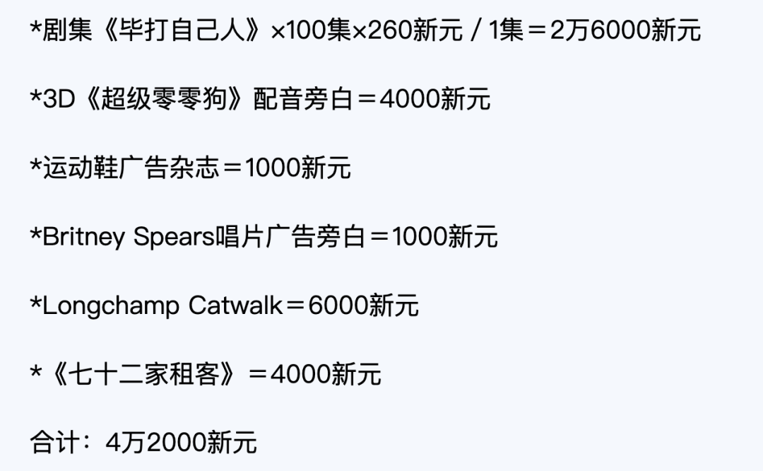 另外做一些配音、杂志广告、旁白广告的杂活儿,怎么算月收入不到2万港币;