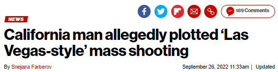 综合纽约邮报等媒体9月26日报道 警方表示,北加州一名男子因涉嫌策划“拉斯维加斯式”大规模枪击事件,并威胁要杀死警察,于昨天(9月25日)被捕。