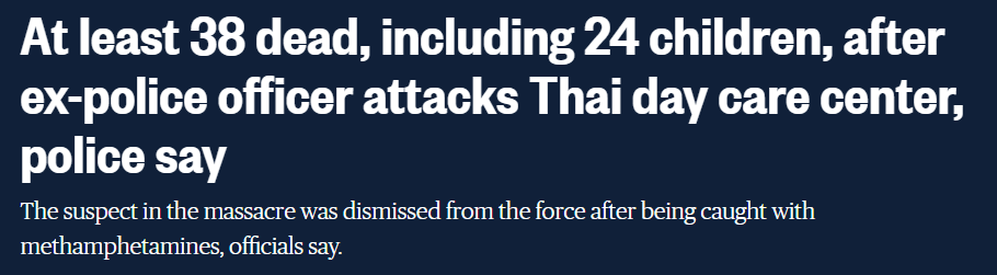 湾区华人资讯网10月6日综合报道 泰国周四爆发了一起惨绝人寰的凶杀事件。一名前警察闯入东北部的一家幼儿园开枪、持刀行凶,造成至少24名儿童惨死。然后他还在逃离现场时朝围观者开枪。