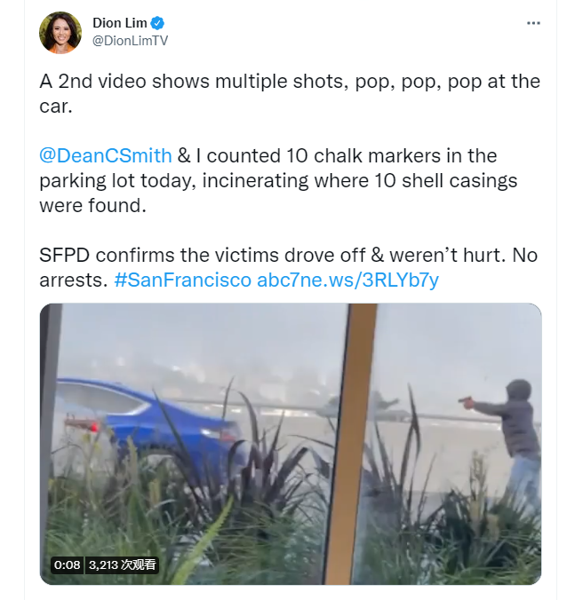 在第二段视频中可以听到嫌疑人向本田车开了多枪。ABC新闻注意到,在这起事件发生的一周之后,人行道上仍有警方用粉笔标记出来的弹壳位置,一共有10个。