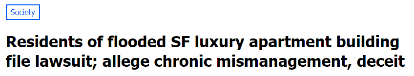 据KTUV 10月11日报道 旧金山市场南社区(South of Market)一栋高层豪华公寓楼中被驱逐的住户们将公寓楼的所有者和管理人员告上了法庭,这些租住在这栋公寓中的住户声称他们被迫遭受了一系列的虐待和非法行为。同时,业主涉嫌对两次大规模漏水处理不当。