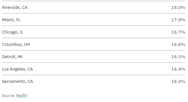 另一方面,在杰克逊维尔(26.1%)、拉斯维加斯(23%)和菲尼克斯(21.6%)等阳光地带城市,购房者退出合同的比例要高得多。根据报告,这些城市“在疫情期间受到欢迎和价格飙升”。