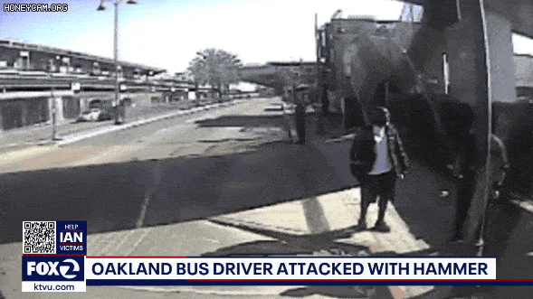 根据KTVU获得的公交车监控录像显示,身穿白衬衫和黑色夹克的司机正在与一名同事交谈。几秒钟后,一个女人穿过马路,用锤子砸向司机的头部。从视频中可以看到,司机将该女子按倒在地,并多次殴打她以自卫。