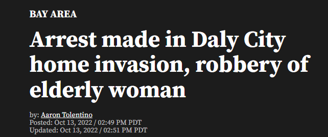 据kron4 10月13日报道 戴利城(Daly City)警方周四在一份新闻稿中宣布,一名涉嫌入室抢劫袭击70岁华裔妇女的嫌疑人已经被捕。