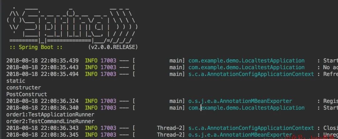@PostConstruct注解的方法。当容器启动成功后,再根据@Order注解的顺序调用CommandLineRunner和ApplicationRunner接口类中的run方法。因此,加载顺序为