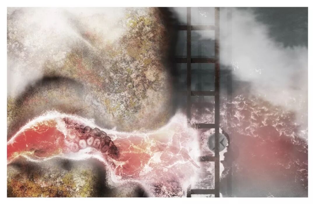 当你年轻的时候,一些年长的人(在平台上出生的第一代人中) 曾经告诉你这个故事。混乱的北海神话混合着简陋的水手传说。一天晚上,一个无名的工程师,醉酒以后又兴奋地喝完了一瓶当地的杜松子酒,蹒跚到一个控制舱,塞紧了进气泵全油门。他们说,移动距离如此之大,以至于一只年轻的海妖,所有的触须和钩子,以及汹涌的眼睛,都从它的潜水艇沟中被拉开,直接冲进了八千万加仑的气囊之一。 When you were younger, some of the older folks -those among the first generation to be born on-platform- used to tell you this story. A kind of confused mash of North Sea mythology and shanty sailor lore, where one night, an unnamed engineer, drunk and restless off mainland brennevin lurched up to a control pod and jammed the intake pumps full throttle. The draw was so great, they said, that a young kraken, all tentacles and hooks and wild rolling eyes, was pulled loose from its submarine trench and swept straight into one of the 80 million gallon bladders.