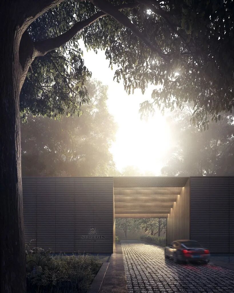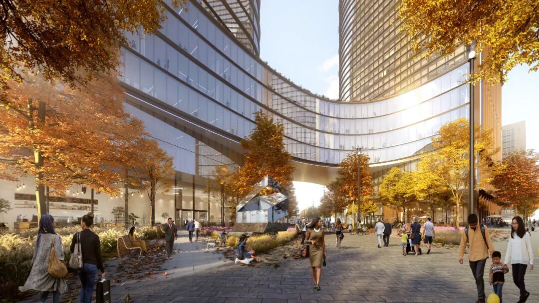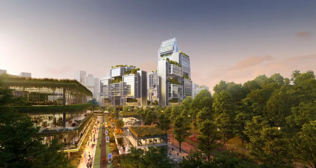 这张图更以对称构图,着重突出设计师受中国传统“门户”概念启发,将塔楼设想为通向枢纽的“门户”之用意。逆光效果下,远景塔楼仿佛不断引领人们奔向未来光明之处。![]()