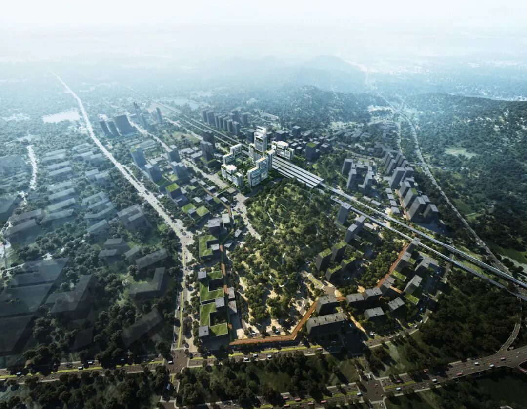 2020年11月,Foster + Partners 公布了深圳光明枢纽TOD获胜方案。该项目位于深圳市光明区东南侧的凤凰城片区,目前是广深港高铁的中间站。以公共交通导向发展的设计提案将关注于“智慧城市如何基于基建设施、有效的交通网络、可靠的公共服务以及充足的自然绿化来高效引导人流和物资的集散。”一张鸟瞰展示了项目全貌,宏大场景、冷暖对比相互映衬、高铁延伸感等皆突出了设计师规划区域的总体印象。© Smilodon