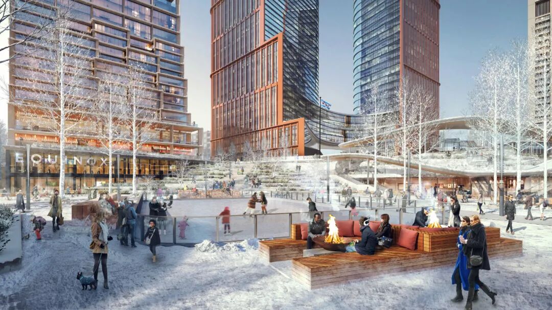 The 78 项目是一个以交通为导向的开发项目,延伸了芝加哥的中央商务区。该项目从街道和水路进入都非常方便,将设有全新水上交通站、新的自行车道和人行道,毗邻当地铁路线。未来项目落成,将会为芝加哥South Loop带来全新的城市景观。上图不仅着重表现出项目的建筑结构,更以清晨为时间设定,植物在阳光下斜长的身影,人们进出建筑大堂,无不刻画出一派充满生机活力的广场氛围。