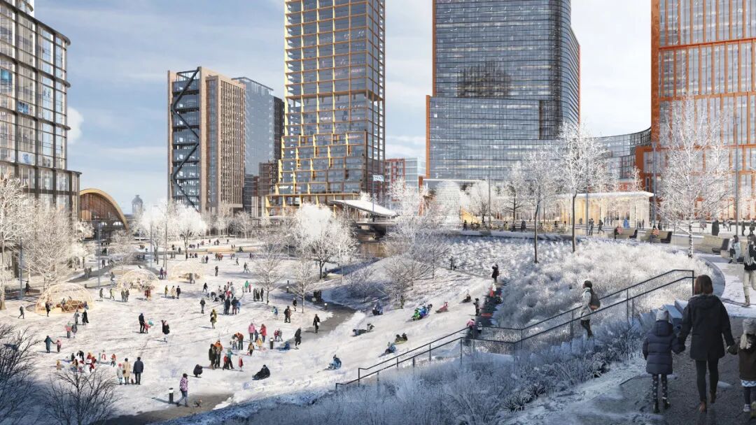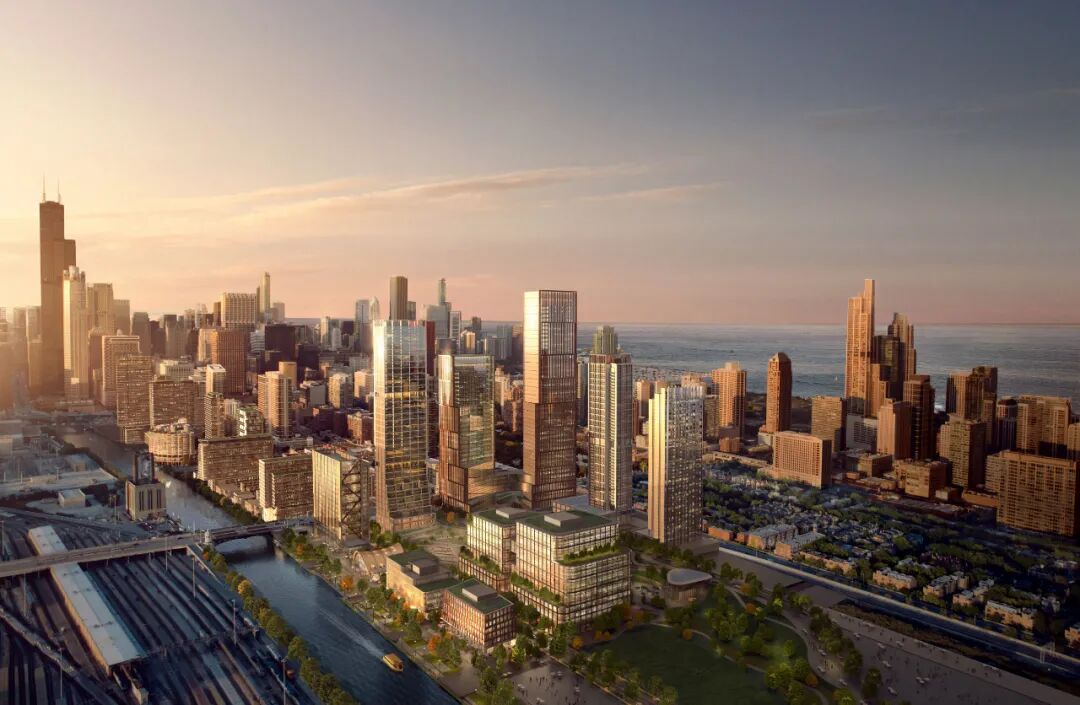 The 78 项目位于芝加哥最具活力、最多样化的地段,即南环路、唐人街、比尔森、小意大利和Bronzeville等的交汇处,与周边社区无缝融合。The 78 占地62英亩,位于芝加哥南岸,沿着河流一路延展达半英里。该地块的开发将为所有市民建立一个充满活力的、集住宅、商业、学术、公民、文化和娱乐为一身的社区。一张黄昏时分的鸟瞰图,突显出项目与周边地块乃至城市的文化历史,无缝融合。![]()