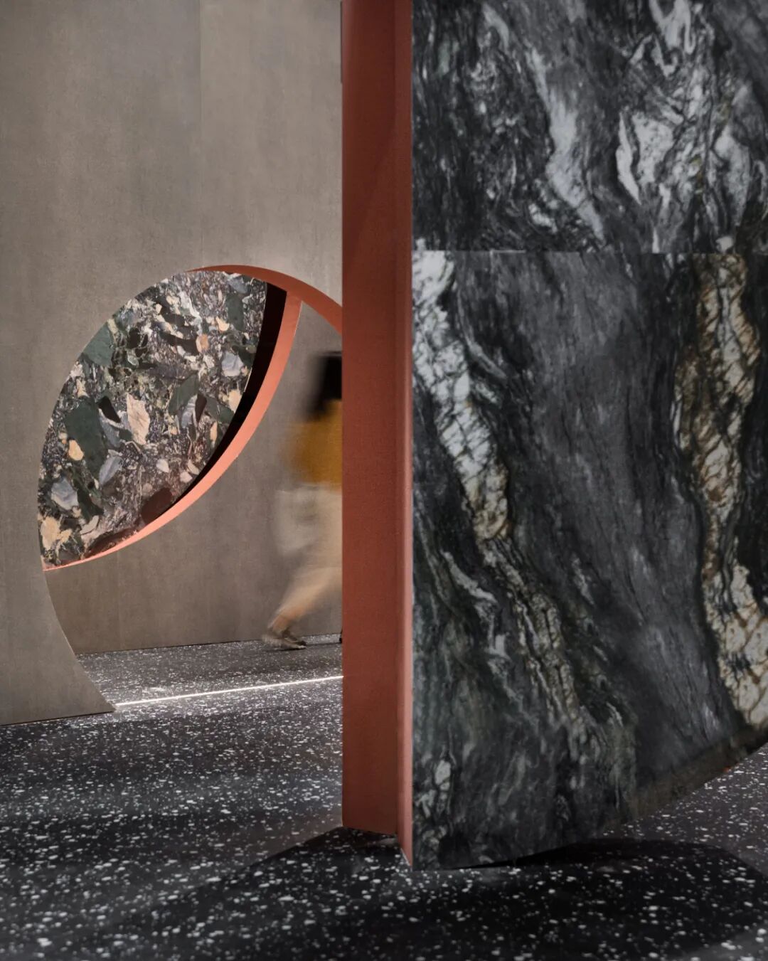 圆形生长出多条直线,层层递进之后,一条斜线打破规则格局,丰富变化的空间应运而生。岩板及生态新材等绿色材料在这样的空间里有机互动,参观行进过程中,人们可以感知全新的材料、体验变化的空间,聆听生态、自然与人之间的对话。