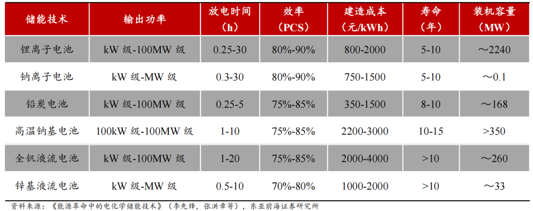 目前,技术成熟度较高的电化学储能技术为锂离子电池,其中磷酸铁锂电池已在储能市场实现规模化应用,其循环寿命为5-10年。钠电池放电时间、效率以及循环寿命与锂电池相似,且其具有较低的制造成本,未来随着钠电池技术的不断成熟以及产业化的推进,钠电池有望受益于新型储能发展机遇。目前主要电化学储能技术关键参数对比如下: