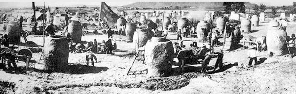 第二天就伐木安家,修简易的住棚、厨房、厕所等。由于住所一时不能建好,开头几天吃饭、睡觉都和第一天晚上一样。伙食很粗糙,有时是红薯,有时是煮熟的苞米,根本不吃菜。经过几天安顿后就投入伐木和筑高炉的劳动。高大的松树由农民伐下,我们帮着锯断成节,改锯成小块搬运到指定的地方。这些是炼铁的燃料。筑高炉主要是挑挖泥土和搬运石块,还要筑土高炉打夯。土高炉是根据全国先进经验仿造的,炉体有三分之二以上的容积堆放木柴,最下面是引火柴草接着是干柴,再往上是生柴(伐木锯下的),生柴数量最多。顶上堆铁矿石(是不是铁矿石我们不知道),最后留下足够的出气孔就算装窑完成。