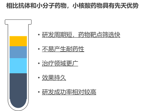 小核酸药物从作用机理来看,能够直接靶向致病靶基因或RNA片段,理论上可以调节任何基因表达,因此其治疗领域更广,有望攻克尚无药物的遗传疾病和其他难治疾病。此外,小核酸药物还具有其他优势,如研发周期短、不易产生耐药性、效果持久、研发成功率较高等,被认为是继小分子药、抗体药后推动医药产业变革的第三代制药创新技术。