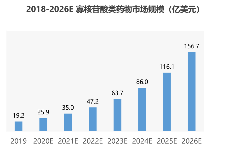 自2016年小核酸药物相关技术壁垒取得突破以来,资本热潮涌入小核酸药物行业,小核酸药物行业得到前所未有的快速发展。据 Evaluate和BCG预测,2026年全球寡核苷酸类药物市场规模将超150亿美元,2020年-2025 年CAGR 35%。