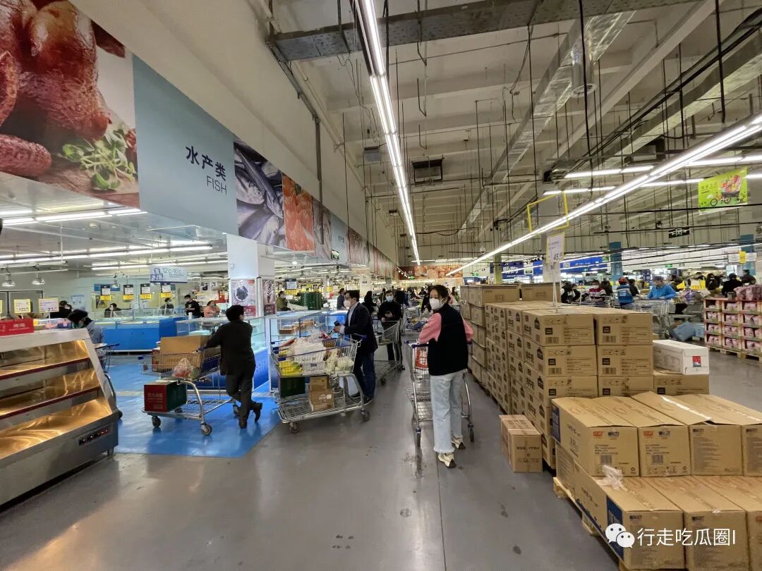 再进入到麦德龙里面,商场里面同样还是人山人海,每个人都推着放满了货物的小推车。从视频来看,货架上面的货物所剩已经寥寥无几。